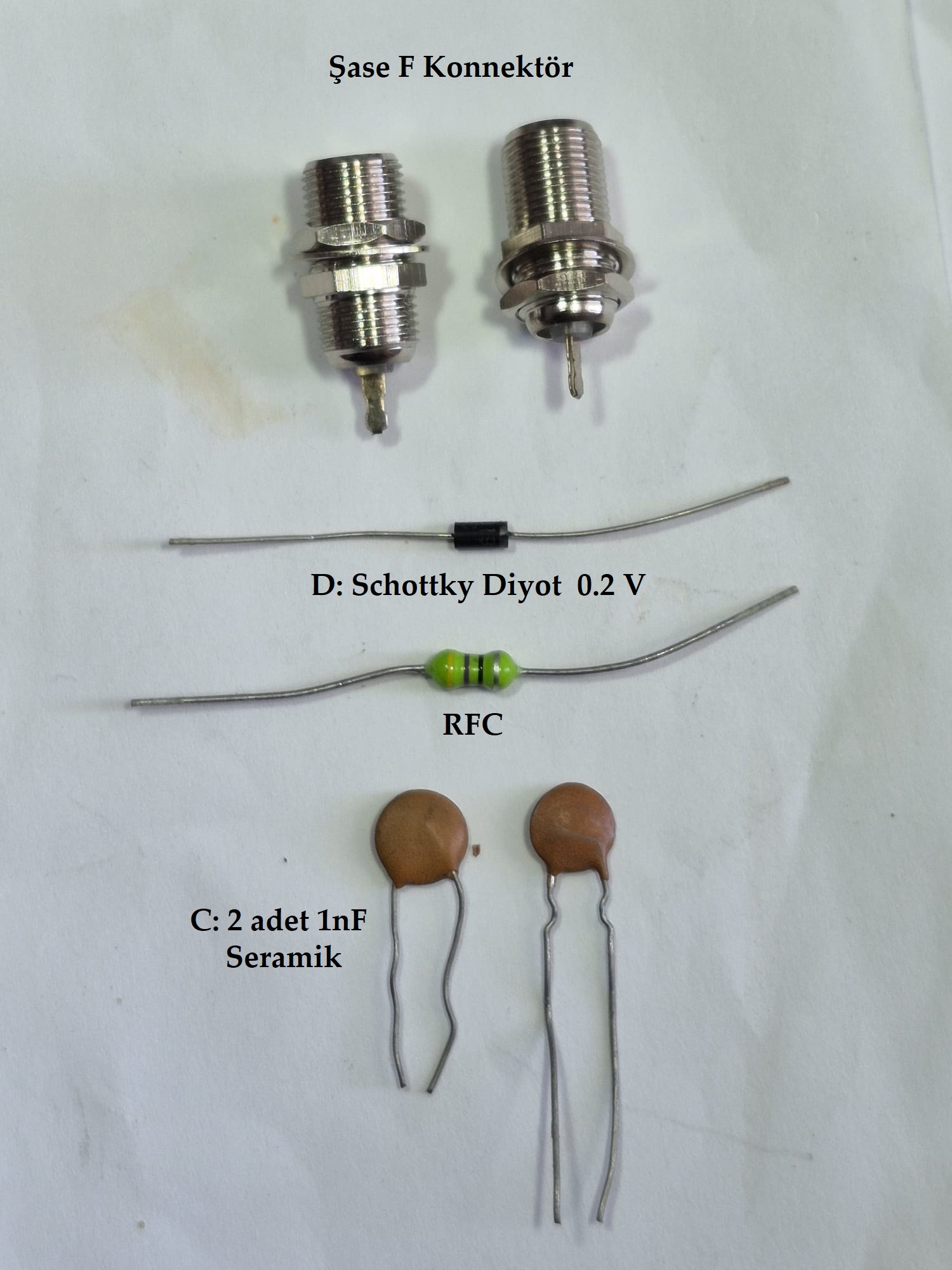 RFC = 1/4 1/8W direnç görünümünde, 2 uH den biraz daha büyük değerde Endüktif parça, Elektronik malzeme satan yerlerde farklı değerleri mevcut olup, 2uH den ufak olmaması tercihtir.